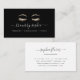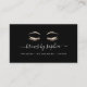 Design de cartão de visita elegante para maquiadores, especialistas em brotos ou lash apresentam seu nome ou nome comercial em tipografia moderna, escrita à mão, destacada com um par exuberante de pestanas e sobrancelhas em folha de ouro falsa sobre fundo preto. Adicione uma linha de texto abaixo em letras pretas correspondentes para sua ocupação ou título. Personalize o lado inverso com seus detalhes de contato. Escolha técnica e profissional para estéticos especializados em serviços de lavagem ou sobrancelha.