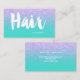 Um cartão de visita moderno, na moda, estilista de cabelos, com tipografia moderna de pincel, em branco, sobre um brilho elegante, brilhante lavanda roxo e meia-sereia turquesa.