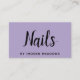 Um cartão de visita elegante para um técnico de unhas, salão de unhas ou artista de unhas. A frente da placa apresenta a palavra 'Unhas em uma fonte de script na moda. Esta design está em uma púrpura de cor. Os modelos de texto são totalmente personalizáveis para atender às exigências de marca e marketing da sua empresa.