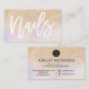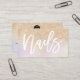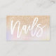 Uma elegante cartão de visita de unhas na moda com elegante escrita com tipografia elegante em estilo de escrita manual, em branco editável, num gradiente falso brilho esparramado ombre e num fundo holográfico iridescente e pastel unicórnio.