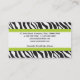 O impressão da zebra faz um fundo impressionante para um quadro ornamentado em uma fita verde-clara das bolinhas neste cartão de visita deobtenção. Um nome da empresa e um contato principal são apresentados no quadro cercado por ornamento encaracolado. O reverso revela toda a informações de contacto entre dois painéis do impressão da zebra acentuados com as fitas polca-pontilhadas verde limão. Disponível em cores alternativas com produtos de harmonização.