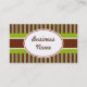 Chocolate escuro e listras verdes vibrantes decoram esta cartão de visita profissional. Personalize esta cartão de visita para atender às suas necessidades. O design é de arte original. Use este cartão de visita de na moda para um salão, chocolate gourmet, cuidados com o gramado, paisagens, catering, barbeiro, cama e café da manhã, boutique, padaria, comprada de café, design de interiores, antiguidades, etc..