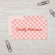 Este cartão de visita de estilo retroativo apresenta um fundo de verificação cor-de-rosa e uma fonte vermelha contrastante. Adicione as informações da sua empresa, mídia social ou site na parte traseira do cartão.