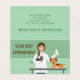 Design de cartão de atendimento ao cliente para veterinários e hospitais de animais para dar aos seus clientes quando reservarem um horário. A design apresenta a ilustração cartoon de Destei de uma veterinária feminina com alguns animais. A mulher está vestindo um casaco de laboratório branco enquanto segura um gato cinza e um pássaro de papagaio tipo cockatiel. Há também um cachorro marrom giro e bonito deitado numa mesa. Há espaço para a data e hora do próximo compromisso do cliente. No verso também há áreas de texto personalizáveis para um nome de negócios e informações. A cor de fundo é verde-claro.