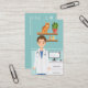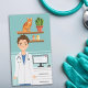 A ilustração fofa original de Destei de um veterinário que está numa clínica veterinária. O veterinário está vestindo um casaco de laboratório branco, esfregões azuis e tem um estetoscópio em volta do pescoço. O veterinário tem cabelo castanho e expressão facial sorridente. Ao lado do veterinário, há um tórax branco de gavetas com uma tela de computador no topo. Na parede há duas prateleiras flutuantes marrons com um gato laranja sentado, uma planta verde e dois frascos de remédios. Por outro lado, há áreas de texto personalizáveis para informações de nome e contato. Há também uma forma de impressão de pata branca que pode ser substituída por um logotipo personalizado, se desejado.