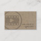 Este cartão de visita de fotografia de um editor de vídeo apresenta um grande ícone negro translúcido e arrojado de um clipe de vídeo. O fundo é uma textura natural de papel marrom-claro, com seu nome e título aparecendo no lado inferior direito do cartão. O design geral é minimalista, perfeito para fotografia, filme, imageamento, artes visuais, temas visuais, profissionais.