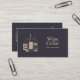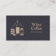 Cartão de visita em preto e dourado, com ilustração de uma garrafa de vinho colocada em frente a uma caixa de madeira e acompanhada por uma rolha de cortiça, um copo de vinho e uma uva. Pode ser usado para um compro de adega, um vinheteiro, um sommelier, etc.