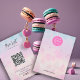 Cartão de expositor branco e sonolento, em cores pastéis, de amarelo pinto roxo e turquesa, com um roteiro de caligrafia.