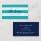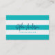 White Stripes e cartão de visita de Script Moderno de Cor Personalizada que apresentam a cor de fundo editável na parte frontal (clique em personalizar e altere a cor de fundo de turquesa para outra cor) e na parte traseira. É fácil personalizar; substitua o texto do marcador de posição por suas próprias informações. Para obter mais opções, como alterar a fonte e seu tamanho/cor ou o espaçamento entre letras, clique no botão "Personalizar". *Observe que a Marca d'água do Zazzle que aparece na visualização de zoom NÃO aparecerá no produto impresso final. © Rosewood e Citrus