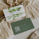 Os cartões de visitas botânicos em chic apresentam seu nome ou nome de empresa flanqueados por uma borda superior e inferior de folhas botânicas de cor d'água pintadas em tons ricos de verde. Adicione as informações de contato do cheio ao fundo em branco no verde-prado, juntamente com um código QR personalizável. Uma escolha única e elegante para designers paisagísticos, arquitetos paisagistas, floristas e empresas ecológicas.