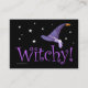 O design roxo e preto do Peck de Linda Baysinger do Dia das Bruxas da bruxa do chapéu, com texto que lê, "Witchy", uma aranha alaranjada e as estrelas.