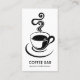 Um cartão de visita atrativo com uma xícara de café quente. Nome da empresa e tipo de negócio na frente com nome e outros dados de contato no verso com uma versão menor do motivo da xícara de café frontal.