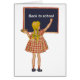 "DE VOLTA À ESCOLA", MENINA VESTINDO UM VESTIDO DE XADREZ VERMELHA E SUAS COSTAS, ESCREVENDO NO CHALKBOARD