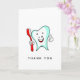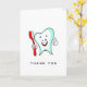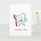 Cartões de agradecimentos com uma ilustração de um estilo de desenho animado grande dente branco sorrindo alegremente segurando uma escova de dente vermelha e dando aos polegares uma placa para cima.