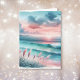 Cartão de aniversário que pode ser personalizado. Bonito cena de praia em azul pastel e rosa. Ondas oceânicas na costa arenosa com delicadas ervas marinhas soprando na brisa num dia nublado enquanto o sol se põe.