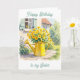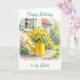 Um cartão de aniversário personalizado bonito para uma irmã. Uma bela ilustração das flores amarelas em uma lata de água amarela. Desejo-lhe um aniversário pacífico.