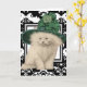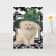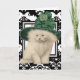 Gato de Cabelo Longo Persa Branco Bonito Vestindo um Chapéu Verde Vintage com Elemento de Véu e um Grande Arco Verde. Cartão de Saudação do Dia de São Patrício com Fundo Floral a Preto e Branco