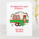 Desejando um Feliz Natal da estrada! Um cartão de aniversário fofo para alguém que está viajando na época do Natal. Uma linda camper RV vermelha e verde decorada com luzes de Natal. Desenho animado feito à mão. Desejando um Feliz Natal e um Ano Novo Aventureiro.