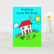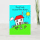 Desenho animado colorido de uma casa feliz com caminho de pedras conduzindo à porta da frente sob um céu azul e sol brilhando. Mensagem deseja boa sorte em sua nova casa.