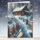 Cartão de Natal. O texto pode ser personalizado no dentro. Um estilo aquoso bonito ai art retratando uma cabana de madeira na floresta nevada.