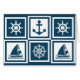 Design com temas náuticos, com roda de vela, barco à vela, bússola e decoração da âncora, em quadrados brancos e azuis com faixas