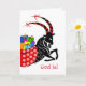Frente personalizada, adicione seu texto a este cartão de saudação de Natal escrito em sueco. Deus Jul "Feliz Natal" no cobrir pode ser mudado por você, se desejado. Ilustração da Iule Goat, Julbocken, com chifres embrulhados em fitas vermelhas e arcos e um saco de presente de carregando no cheio de presentes. Design cor e cor em cores marcantes. Dentro de mensagem em sueco = Feliz Natal e Feliz ano novo. Arte, imagem e direitos de autor © Shoaff Ballanger Studios.