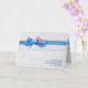 margarida cor-de-rosa em fita azul e branca de bolinhas sobre o fundo de madeira em branco para o Dia do Nome