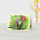 Este cartão de Dia de as mães apresenta um jovem beija-flor de garganta rubi. Ele ainda não desenvolveu a coloração rubi em sua garganta. Ele está sentado sobre um bar de metal, pronto para mergulhar no néctar das flores que o rodeiam. O fundo é uma paleta suave e adorável de rosa, vermelho, dourado, amarelo e verde. Mais beija-flores são dentro. Você pode personalizar o texto de acordo com as suas necessidades.