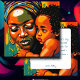 Obrigado, mãe. Bonito e colorida arte ai abstrato... tons quentes de marrom, verde e azul. Ilustração de uma mãe afro-americana segurando uma criança com uma mensagem sentimental personalizada na parte de trás deste cartão de Dia de as mães. Você pode editar a mensagem no verso para dizer o que quiser.