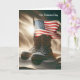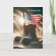 Um par de botas de combate robustas na areia do deserto, enrolado pela janela, com uma bandeira americana balançando dinamicamente sobre eles. Todo o texto pode ser mudado.