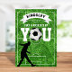 Cartão de dia de os namorados sobre temas desportivos com um fundo de campo de futebol de grama verde, seu nome de dia de os namorados, uma silhueta de um jogador de futebol, e o bonito ditado "Eu dou um chute a você" com um futebol como a letra O.