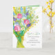 Um bonito cartão floral religioso para Dia de os namorados com uma escritura do livro de Bíblia de 1 John 4:16 e decorado com um buquê de flores rosa, azuis e roxas brilhantes pintado à mão com aquarela. No dentro é o texto que você pode editar para ajustado suas necessidades e outra flor.