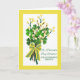 Dia de Patrick para seus pais com um cartão de saudação alegre de design floral amarelo, verde e branco. Fechos ou galhos de camarão e galhos de forsythia com pequenos botões amarelos, juntamente com rebençados jovens, estão todos amarrados com uma fita e um arco de cor amarela e verde, de padrão branco pontilhado. (Fita/arco é uma fotografia — não real) Art, image e verse © Shoaff Ballanger Studios, 2021.