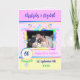Cartão de saudação para um Aniversário de Casamento de Diamante. Adicione nomes, uma foto e a data estabelecida, 60 anos felizes juntos. Rosa e um esquema de cores gradiente de azul, verde e amarelo, com corações amorosos e formas de espiral.