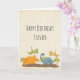 Cartão de aniversário com um design bonito com 4 dinossauros. 2 estão voando e 2 estão no chão. Criado com aquarelas.