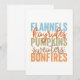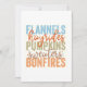 Este vibrante e texturizado design de outono destaca os elementos quintessenciais da estação com as palavras "Flannels", "Hayrides", "Pumpkins", "Sweaters" e "Bonfires". Cada palavra é exibida em letras maiúsculas e negrito, com uma textura desgastada que dá ao design um visual rústico e vintage. A paleta de cores inclui azuis frios, laranjas quentes, verdes terrosos e marrons suaves, capturando as diversas cores do outono. As palavras "hayrides" e "sweaters" são escritas em uma fonte cursiva fluida que contrasta lindamente com o texto em bloco, adicionando um toque de elegância e movimento ao design. Pequenos enfeites de estrelas estão espalhados ao redor do texto, adicionando uma camada extra de charme e alegria.