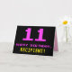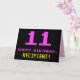 A frente deste design de cartão de saudação divertido, nerd e geek de aniversário apresenta um grande número "11" e a mensagem "FELIZ ANIVERSÁRIO", cor-de-rosa, juntamente com um nome de destinatário de edição amarelo ousado. O texto apresenta uma aparência inspirada pela dos gráficos antigos de jogos para computador/vídeo, estilo 8 bits, das décadas de 1970 e 1980, e o plano de fundo é preto. O dentro tem uma mensagem de saudação de aniversário personalizada, ou talvez possa ser limpo e vazio à esquerda se uma mensagem for escrita à mão. Um bobo de aniversário personalizável como este pode ser uma maneira divertida de enviar uma mensagem para comemorar o décimo primeiro aniversário de alguém. [~Z0000478]