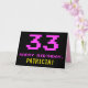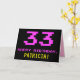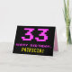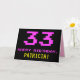 A frente deste design de cartão de saudação de aniversário divertido, nerd e geeky apresenta um grande número "33" e a mensagem "FELIZ ANIVERSÁRIO", cor-de-rosa, juntamente com um nome de destinatário de edição amarelo ousado. O texto tem uma aparência inspirada no jogo clássico de 8 bits e nos gráficos de jogos de computador das décadas de 1970 e 1980, e o plano de fundo é preto. O dentro tem uma mensagem de saudação de aniversário personalizada, ou talvez possa ser apagado e deixado o vazio se uma mensagem for escrita à mão. Um bobo de aniversário personalizado como este pode ser uma maneira divertida de enviar uma mensagem para comemorar o trigésimo terceiro aniversário de alguém. [~Z0000478]