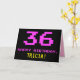 A frente deste design de cartão de saudação divertido, nerd e geek de aniversário apresenta um grande número cor-de-rosa "36", juntamente com a mensagem "FELIZ ANIVERSÁRIO", em rosa, e um nome de destinatário personalizável, amarelo e arrojado. O texto tem uma aparência inspirada no estilo clássico de gráficos de jogos para computador/vídeo de 8 bits dos anos 1970 e 1980, e o plano de fundo é preto. O dentro apresenta uma mensagem de saudação de aniversário personalizável, ou talvez possa ser limpo e vazio à esquerda se uma mensagem for escrita à mão. Um bobo de aniversário personalizável como este pode ser uma maneira divertida de enviar uma mensagem para comemorar o trinta e seis anos de alguém. [~Z0000478]