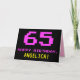 A frente deste design de cartão de saudação de aniversário divertido, geek e nerdy apresenta um grande número "65" e a mensagem "FELIZ ANIVERSÁRIO", cor-de-rosa, juntamente com um nome de destinatário personalizado amarelo ousado. O texto tem um aspecto inspirado no jogo clássico de 8 bits e nos gráficos de jogos de computador dos anos 70 e 80, e o plano de fundo é preto. O dentro apresenta uma mensagem de saudação de aniversário personalizável, ou talvez possa ser limpo e vazio à esquerda se uma mensagem for escrita à mão. Um bobo de aniversário personalizável como este pode ser uma maneira divertida de enviar uma mensagem para comemorar o sexagésimo quinto aniversário de alguém. [~Z0000478]