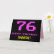 A frente deste design de cartão de saudação de aniversário divertido, nerd e geeky apresenta um grande número "76" e a mensagem "FELIZ ANIVERSÁRIO", cor-de-rosa, juntamente com um nome de destinatário personalizado amarelo e ousado. O texto tem uma aparência inspirada no estilo clássico de 8 bits de jogos de computador e gráficos de jogos de vídeo dos anos 70 e 80, e o plano de fundo é preto. O dentro tem uma mensagem de saudação de aniversário personalizada, ou talvez possa ser apagado e deixado o vazio se uma mensagem for escrita à mão. Um bobo de aniversário personalizável como este pode ser uma maneira divertida de celebrar os setenta e seis anos de alguém. [~Z0000478]
