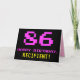 A frente deste design de cartão de saudação de aniversário divertido, geek e nerdy apresenta um grande número cor-de-rosa "86", juntamente com a mensagem "FELIZ ANIVERSÁRIO", em rosa, e um nome de destinatário personalizado amarelo ousado. O texto apresenta uma aparência inspirada na dos gráficos retrorados de jogos para computador/vídeo de 8 bits das décadas de 1970 e 1980, e o plano de fundo é preto. O dentro tem uma mensagem de saudação de aniversário personalizada, ou talvez possa ser limpo e vazio à esquerda se uma mensagem for escrita à mão. Um bobo de aniversário personalizado como este pode ser uma maneira divertida de celebrar o oitenta e sexto aniversário de alguém. [~Z0000478]
