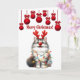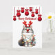 Este Cartão de Natal Engraçado Adorável, Engraçado, apresenta um Gato Misquioso Bobo. Acima da cabeça, pendura Enfeites de natal brilhantes. Este Gatinho Whimsical tem um Grande Nariz Vermelho Rudolph, Deer Antlers, e está enredado em Luzes de Natal. Perfeito para Cat Lovers que apreciam um pequeno aborto de Férias! Este Cartão de Gato Xmas tem um Verso Engraçado no dentro. Personalize este cartão de Natal para o seu conteúdo!