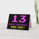 A frente deste design de cartão de saudação de temas divertidos, geek e nerdy aniversário apresenta um grande número cor-de-rosa "13", juntamente com a mensagem "HAPPY BIRTHDAY", em cor-de-rosa, e um nome de destinatário personalizado amarelo ousado. O texto apresenta uma aparência inspirada pela do estilo antigo, jogos de computador e gráficos de jogos de vídeo de 8 bits dos anos 1970 e 1980, e o fundo é preto colorido. O dentro apresenta uma mensagem de saudação de aniversário personalizada, ou talvez possa ser apagado e deixado o vazio se uma mensagem for escrita manualmente. Um cartão de aniversário personalizado de bobo como este pode ser uma forma divertida de celebrar o décimo terceiro aniversário de alguém. [~Z0000478]