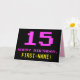 A frente deste design de cartão de saudação divertido, nerd e geeky aniversariante apresenta um grande número cor-de-rosa "15", juntamente com a mensagem "FELIZ ANIVERSÁRIO", em rosa, e um nome de destinatário personalizado amarelo ousado. O texto tem uma aparência inspirada no estilo de vídeo/gráficos de jogos de computador vintage de 8 bits das décadas de 1970 e 1980, e o fundo é preto colorido. O dentro tem uma mensagem de saudação de aniversário personalizada, ou talvez pudesse ser apagado e deixado vazio se uma mensagem fosse escrita manualmente. Um cartão de aniversário personalizado de bobo como este pode ser uma forma divertida de celebrar o décimo quinto aniversário de alguém. [~Z0000478]