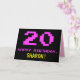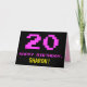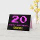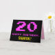 A frente deste design de cartão de saudação divertido, geek e com temas nerds de aniversário apresenta um grande número cor-de-rosa "20", juntamente com a mensagem "HAPPY BIRTHDAY", em rosa, e um nome de destinatário personalizado amarelo ousado. O texto apresenta uma aparência inspirada no estilo antigo de gráficos de jogos de computador/vídeo de 8 bits dos anos 70 e 80, e o fundo é preto colorido. O dentro apresenta uma mensagem de saudação de aniversário personalizável, ou talvez possa ser apagado e deixado o vazio se uma mensagem for escrita manualmente. Um cartão de aniversário personalizável como este pode ser uma maneira divertida de enviar uma mensagem celebrando o vigésimo aniversário de alguém. [~Z0000478]
