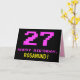 A frente deste design de cartão de saudação com temas divertidos, nerds e nerds de aniversário apresenta um grande número "27" e a mensagem "FELIZ BIRTHDAY", cor-de-rosa, juntamente com um nome de destinatário personalizável amarelo arrojado. O texto apresenta uma aparência inspirada no estilo de videogame vintage de 8 bits e nos gráficos de jogos de computador das décadas de 1970 e 1980, e o fundo é preto colorido. O dentro tem uma mensagem de saudação de aniversário personalizada, ou talvez pudesse ser apagado e deixado vazio se uma mensagem for escrita manualmente. Um cartão de aniversário personalizável como este pode ser uma forma divertida de celebrar o vigésimo sétimo aniversário de alguém. [~Z0000478]