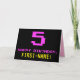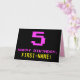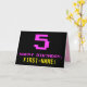 A frente deste design de cartão de saudação de aniversário divertido, geek e nerdy apresenta um grande número "5" e a mensagem "HAPPY BIRTHDAY", cor-de-rosa, juntamente com um nome de destinatário personalizado amarelo arrojado. O texto tem uma aparência inspirada pelo estilo clássico de 8 bits de gráficos de jogos de computador e vídeo dos anos 70 e 80, e o fundo é preto colorido. O dentro apresenta uma mensagem de saudação de aniversário personalizada, ou talvez possa ser apagado e deixado vazio se uma mensagem for escrita manualmente. Um cartão de aniversário personalizado de bobo como este pode ser uma maneira divertida de reconhecer o quinto aniversário de alguém. [~Z0000478]