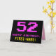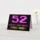 A frente deste design de cartão de saudação de aniversário divertido, nerd e geek apresenta um grande número "52" e a mensagem "FELIZ BIRTHDAY", cor-de-rosa, juntamente com um nome de destinatário personalizado amarelo arrojado. O texto tem uma aparência inspirada no estilo de vídeo/gráficos de jogos de computador vintage de 8 bits das décadas de 1970 e 1980, e o fundo é preto colorido. O dentro tem uma mensagem de saudação de aniversário personalizada, ou talvez possa ser apagado e deixado vazio se uma mensagem for escrita manualmente. Um cartão de aniversário personalizável como este pode ser uma maneira divertida de reconhecer o cinquenta segundo aniversário de alguém. [~Z0000478]