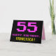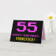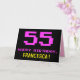 A frente deste design de cartão de saudação de aniversário divertido, nerd e geeky apresenta um grande número cor-de-rosa "55", juntamente com a mensagem "HAPPY BIRTHDAY", em cor-de-rosa, e um nome de destinatário editável amarelo arrojado. O texto apresenta uma aparência inspirada no estilo de videogame vintage de 8 bits e nos gráficos de jogos de computador das décadas de 1970 e 1980, e o fundo é preto colorido. O dentro tem uma mensagem de saudação de aniversário personalizada, ou talvez pudesse ser apagado e deixado vazio se uma mensagem fosse escrita manualmente. Um cartão de aniversário personalizável como este pode ser uma maneira divertida de reconhecer os cinquenta e cinco anos de alguém. [~Z0000478]